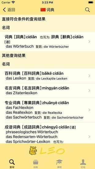 支持进行德语和其他语言的互译,也支持一些其他语言的互译。应用内置智能搜索算法,能够快速准确地找到所需词汇。支持将生词进行收藏反复学习,加深理解和记忆,在当做词典的同时还可以学习外语。系统会根据用户的学习进度智能推荐复习内容。为您提供多语种的词典翻译服务,每个语种也配备了与之对应的论坛和词汇训练功能。此外,leo还推出了涵盖所有语种的语言课程,由专业教师录制,帮助用户系统掌握语言知识。
