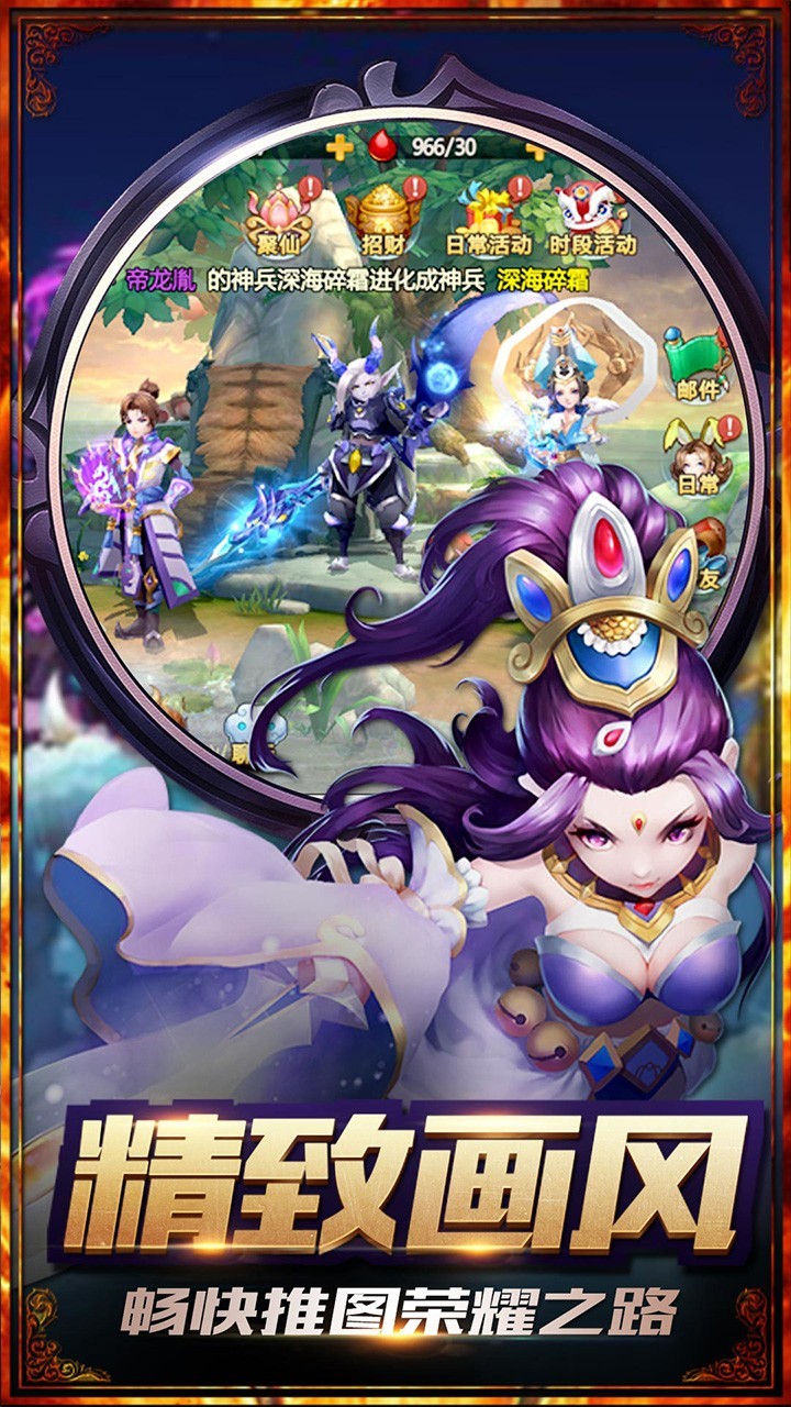 游戏独创四大种族系统,包含鬼、妖、仙、佛等数十位传奇神将,每位神将都拥有独特的技能和背景故事。玩家可以通过收集碎片召唤心仪的神将,并通过培养、进阶等方式不断提升其实力。随着游戏的深入,你将组建属于自己的最强战队,在三界争霸中一展身手,问鼎巅峰!