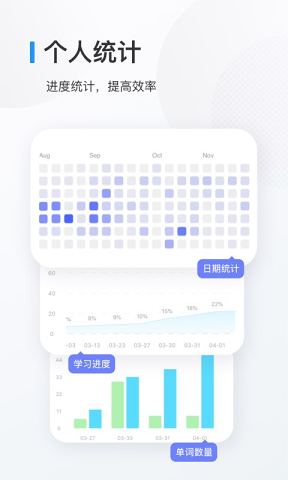 直观的数据图表展示学习进度,包括打卡日历、日期统计、学习进度、单词学习统计等。这些数据可以帮助用户分析学习效果,调整学习策略。历史学习记录一目了然,进步看得见。