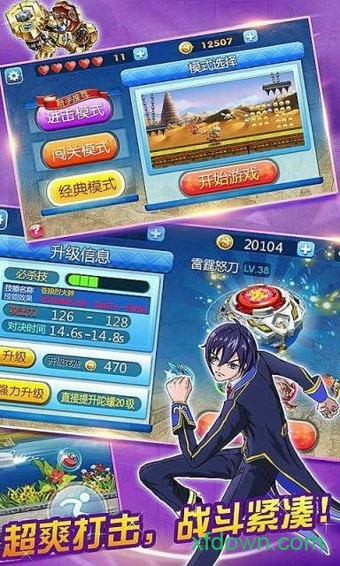 游戏提供三种特色玩法模式:进击模式融合了动作与策略元素,需要玩家灵活运用攻击消灭敌人;闯关模式包含数十个精心设计的关卡,每个关卡都有独特的目标和隐藏奖励;经典模式则是考验玩家持久力的无尽挑战。特别值得一提的是,进击模式中会随机出现动画中的经典BOSS战,触发震撼的陀螺对决场景。游戏还定期更新限时活动和赛季玩法,让玩家始终保持新鲜体验。社交系统支持好友组队,可以一起挑战高难度副本。