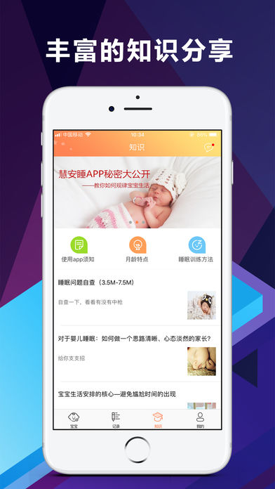 功能三,丰富的知识分享:根据宝宝的月龄,慧安睡app会定期推送相关的睡眠知识和育儿技巧。此外,app还提供公众号文章库,内含大量实用的育儿干货,帮助家长在照顾宝宝的过程中获得更多专业指导。