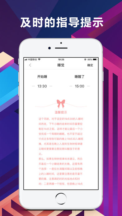 功能二,及时的指导提示:在使用过程中,慧安睡app会通过推送通知和提示功能,向家长解释每一项生活安排的科学依据。这不仅让家长能够更好地执行计划,还能帮助家长理解婴幼儿睡眠的原理,提升育儿知识水平。