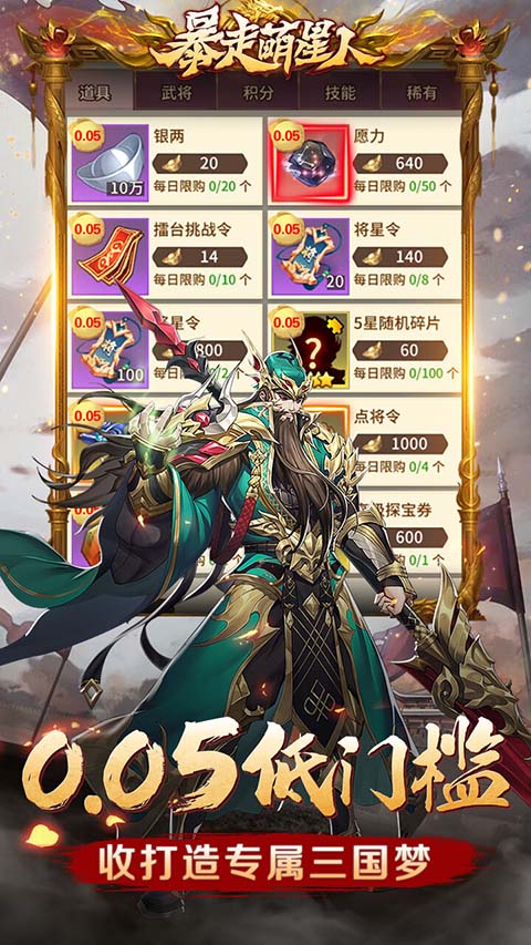 超值折扣福利:所有道具、武将、资源包均享0.05折钜惠,1元当200元花!平民玩家也能轻松集齐五虎上将,打造顶级阵容,体验土豪般的游戏快感。