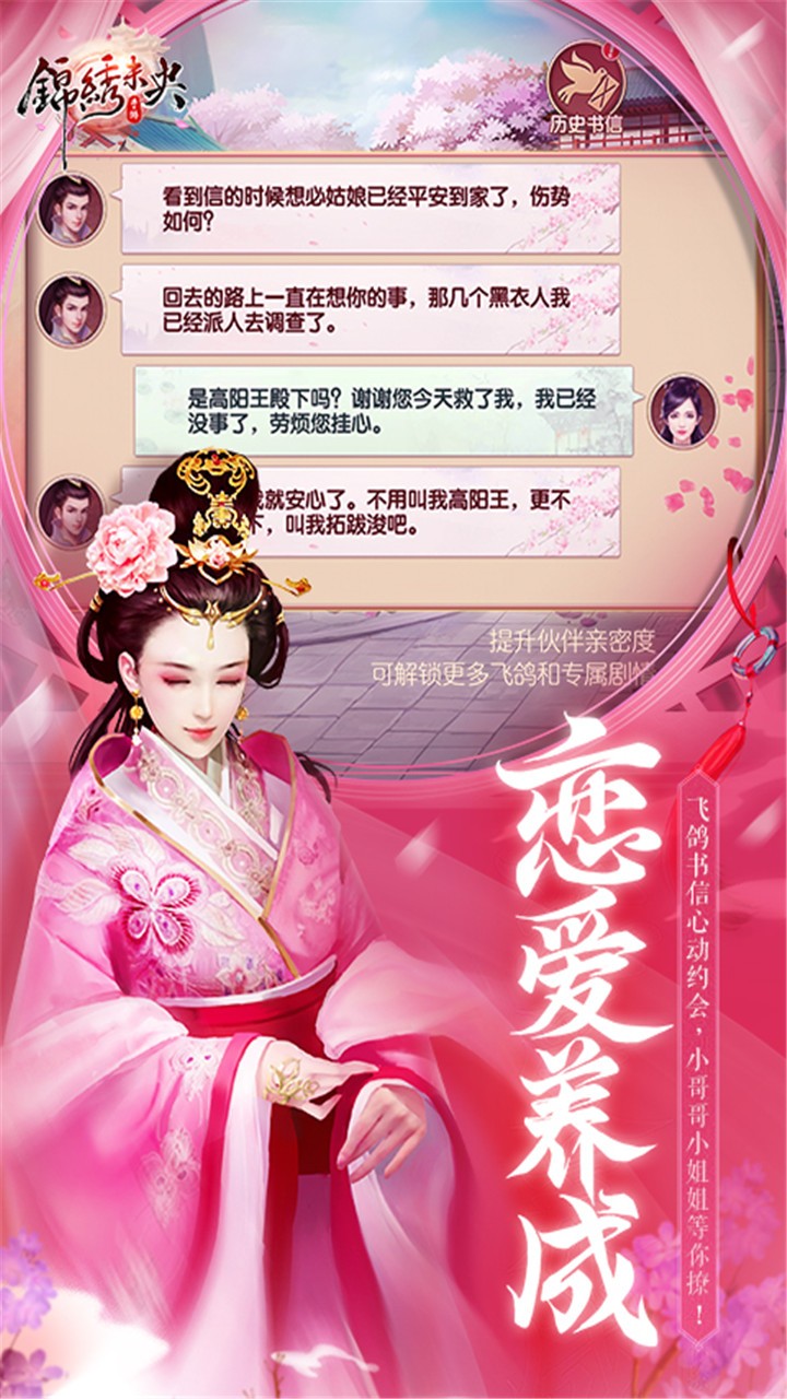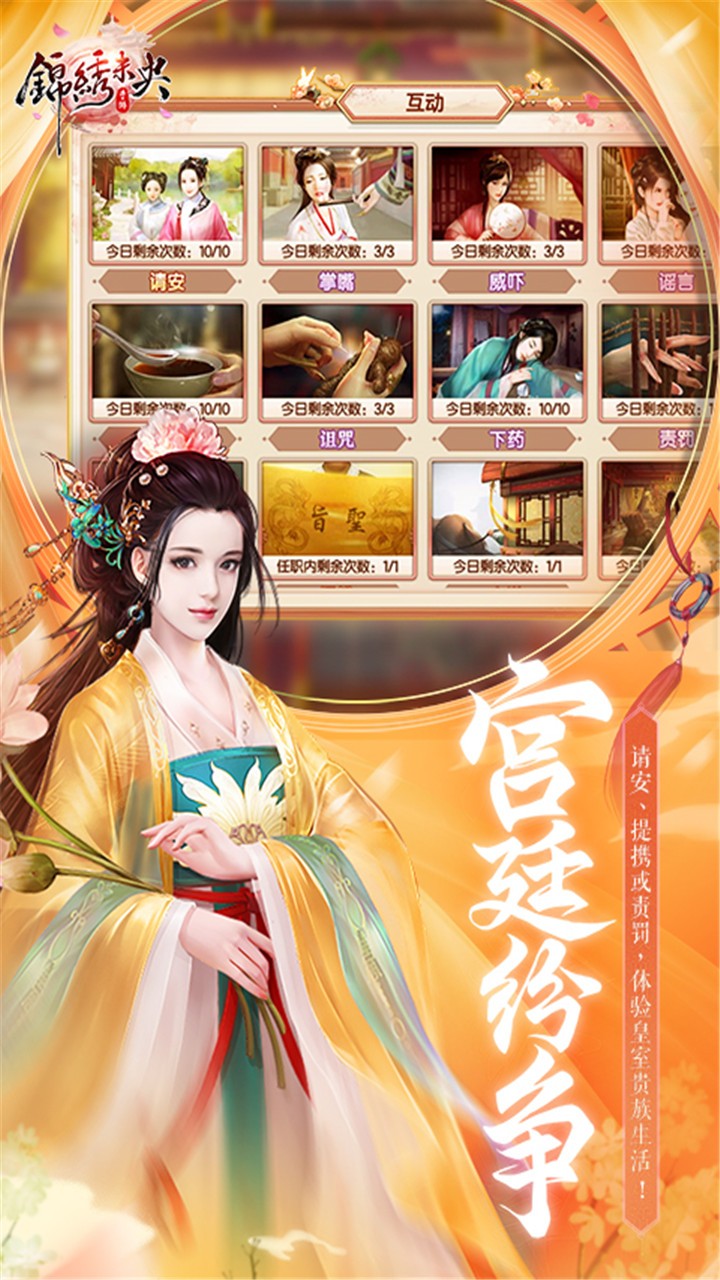 《锦绣未央》手游不仅完美还原了电视剧的精彩剧情,更通过丰富的游戏玩法和创新的互动体验,让玩家能够亲身参与到这个荡气回肠的故事中。无论是精美的画面、动人的音乐,还是扣人心弦的剧情、丰富多样的玩法,都让这款游戏成为古风恋爱养成类手游中的精品之作。