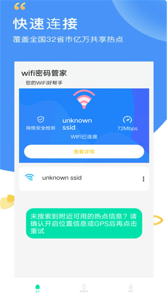 WiFi安全检测,让你安心上网;可识别钓鱼WiFi,保护您的隐私数据不被窃取。