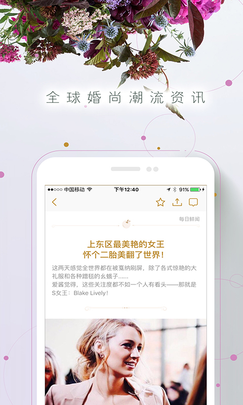 "每日鲜闻"板块24小时不间断更新全球婚尚资讯,涵盖名人爱情故事、最新时尚派对、前沿生活方式等内容,让用户随时掌握婚礼潮流趋势。