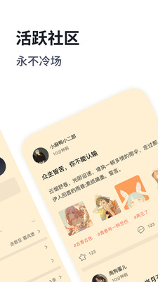2、活跃社区,永不冷场。24小时都有书友在线讨论,无论是深夜还是清晨,都能找到志同道合的伙伴交流心得。