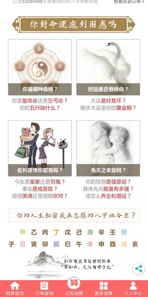 八字占卜大师软件,一款好用的八字万年历算命,万年历、黄历测算你今天,一周,甚至一生的运势。是一款专业的万年历八字算命占卜工具。人的一生要经历太多事,然而可以通过万年历算命,得知人在这短短的一生可以飞黄腾达,荣华富贵,或一辈子碌碌无为,穷困潦倒。如何知晓自己的一生,告别碌碌无为,就用我们的万年历,一键算命便知。到底是什么让每个人万年历算命出来的命运差距如此之大?人的命运从一开始就真的被写好了吗?中华传统八字文化历经上千年依旧拥有旺盛的生命力,历代八字万年历算命学家不断完善和验证算命结论,造就了我们民族独有的探索生命的智慧。软件采用最新AI算法,结合传统命理典籍,确保预测结果既符合传统又与时俱进,为用户提供最准确的命理分析服务。