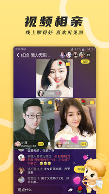 视频相亲:创新的三方视频相亲模式,专业红娘全程陪伴,为单身男女牵线搭桥。通过实时视频互动,真实展现个人魅力,告别传统相亲的尴尬。