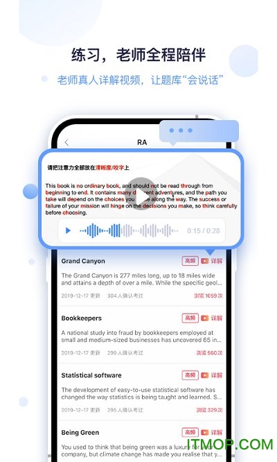 app使用了智能AI技术来辅助考生判断发音准确度,是每一位培生PTEacademic考生考试必备的黑科技练习工具。评分系统采用与官方考试相同的评分算法,能精准指出发音、流利度等方面的问题,并提供针对性改进建议。