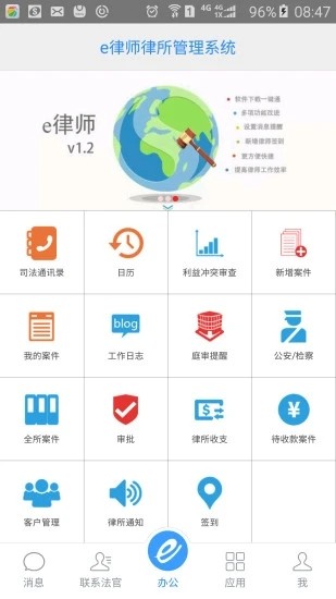 e律师律师端官方版深度融合云计算、大数据等先进技术,针对律师行业的工作特点进行了深度优化。其简洁直观的操作界面、严谨的权限管理体系以及创新的实用功能,让律师能够更加专注于业务本身。应用支持全面的冲突检索功能,确保案件处理的准确性;同时,立案通知、开庭通知、宣判通知、上诉通知、日程提醒等各类消息推送及时准确,帮助律师合理安排工作时间。此外,事务所管理功能让团队协作更加顺畅,显著提升整体工作效率。