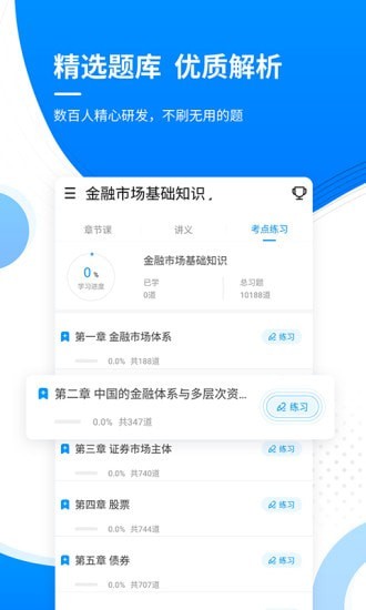 金融类学员考证都在用的备考APP,马上下载去体验!专为金融考试学员精心准备的考试配套题库,内容涵盖:精选题库、强师讲解、章节精讲、高频考点、高频易错、历年真题、冲刺密卷等多个模块,随时随地学习、省时省力备考。题库内容根据最新考试大纲实时更新,确保学员掌握最新考点和命题趋势,大幅提升考试通过率。