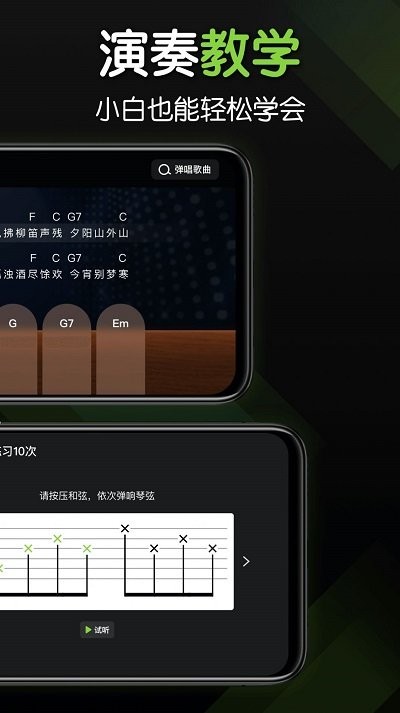 --丰富和弦库可播放,单个或组合和弦练习轻松掌握。系统内置上千种和弦变化,支持慢速播放和循环练习功能;