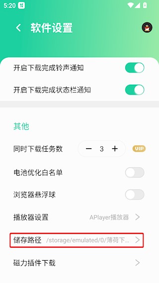 打开薄荷下载APP后,点击右下角的"我的"个人中心图标,进入个人设置页面。在"我的"界面中找到"高级设置"选项并点击进入,这里包含了软件的各项高级配置。在"存储路径"设置项中,可以清晰地看到所有下载文件的保存位置,用户也可以在此修改默认的存储目录,方便后续文件管理。软件还支持自动分类存储功能,不同类型的文件会被保存到对应的文件夹中。