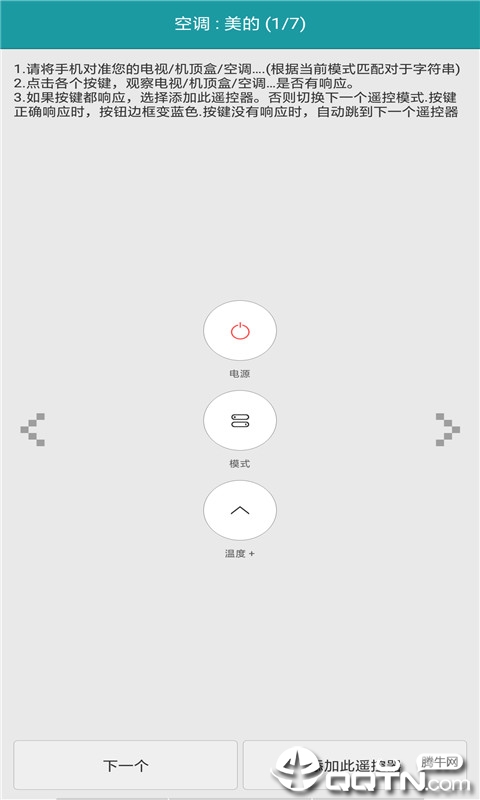 请将手机对准您的电视/机顶盒/空调等设备,确保信号传输畅通无阻。点击各个功能按键,观察设备是否有响应,确认遥控效果。如果按键都能正常响应,即可选择添加此遥控器,否则可以切换下一个遥控模式进行尝试。当按键正确响应时,按钮边框会变成蓝色提示,如果没有响应,系统会自动跳到下一个遥控器模式,确保您能找到最适合的遥控方案。