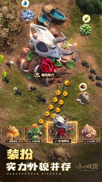 在广阔的地表世界中,玩家将遭遇上百种形态各异的蚂蚁天敌。面对这些威胁,玩家需要根据特化蚁的技能特点和克制关系,灵活调整战斗策略。游戏中的每场战斗都是对玩家战术思维的考验,胜利往往属于那些善于观察和分析的指挥官。