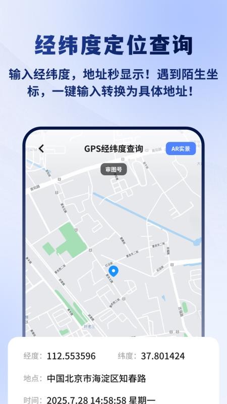 GPS经纬度查询软件手机版是一款功能强大的户外探索工具,集定位、卫星地图、经纬度查询等实用功能于一体。用户可以通过该软件实时获取当前位置的精确经纬度信息,轻松辨别方向,为户外活动提供精准导航支持。软件内置高清卫星地图,可直观查看周边地形地貌,帮助用户全面掌握环境信息,规划最佳出行路线。此外,AR实景指南针功能能够实时显示用户当前方向,进一步提升定位准确性。无论是徒步旅行、野外探险还是日常出行,这款软件都能为用户提供便捷可靠的定位服务,让户外探索更加轻松有趣。