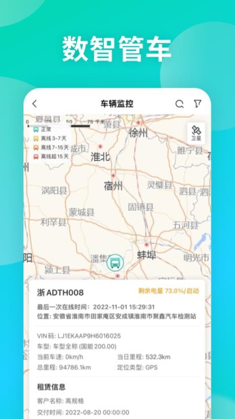 车辆监控,可以实时监控车辆,了解车辆情况,系统会主动推送异常状态提醒,确保行车安全。