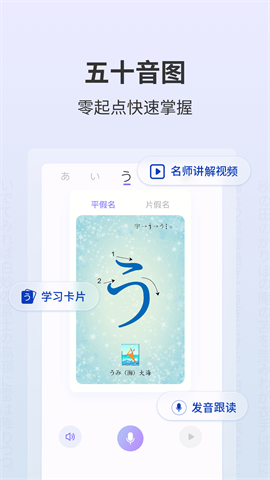 【五十音图】为初学者精心设计的五十音图学习模块,包含平假名和片假名的发音示范、笔顺动画、罗马音标注等完整教学内容。特别配备外研社名师精讲视频课程,通过趣味记忆法和大量练习,手把手教会用户掌握五十音的规范书写与准确发音。