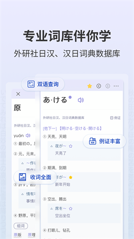 【权威词库】收录词汇源自外研社日汉汉日词典数据库,由专业日语教育团队精心整理审校,包含超过10万条常用词汇和例句,覆盖N5-N1各个等级,为用户提供准确可靠的词典查询服务。词库还支持离线使用,方便随时查阅。