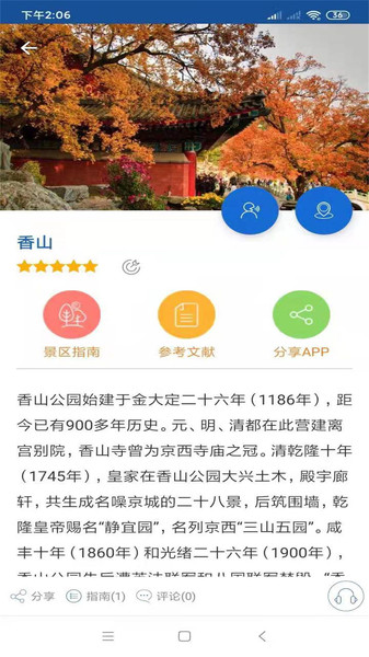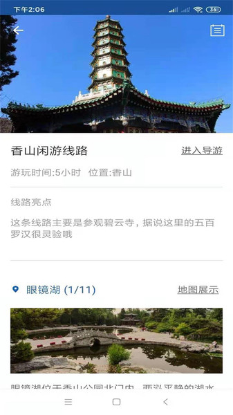 香山旅行语音导游是一款专为香山游客打造的智能导航应用,集景点导览、路线规划、天气查询、住宿预订等实用功能于一体。通过这款APP,游客可以轻松获取香山周边吃喝玩乐的全方位信息,还能租车自驾,沿途欣赏美景。APP内置精准导航系统,帮助用户避开弯路,优化行程安排,让您的香山之旅更加便捷愉快。无论是赏枫、登山还是文化探索,这款应用都能为您提供贴心服务,成为您游览香山的得力助手。