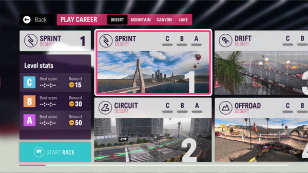 丰富的地形能够满足玩家们的所有游戏需求,还为玩家们提供了多种挑战模式。游戏包含计时赛、淘汰赛、漂移挑战等8种不同玩法,无论是追求速度的竞速爱好者,还是钟情技巧的漂移达人,都能找到适合自己的游戏方式。特殊的地形设计如陡坡、急弯、跳跃点等,为比赛增添了更多变数和乐趣。