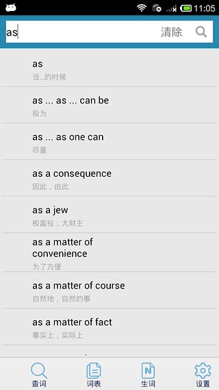 收词规模科学合理。App收录的5万多条词汇涵盖了大学英语四六级、硕博阶段核心词汇以及其他常用英语词汇,完全能够满足非英语专业大学生的日常学习、查阅和考试需求。