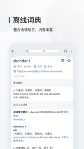 2、例句库包含20000+条来自FranceInter等媒体的原声素材,所有例句均标注CEFR等级。长按单词可查看其在《小罗贝尔词典》中的权威释义,并听到地道巴黎口音朗读。