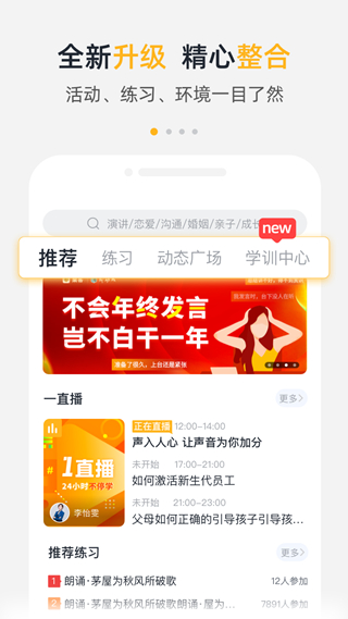 平台采用云端同步技术,您的学习进度和收藏内容可以在多设备间无缝切换。2、操作界面简洁直观,新手也能快速上手,专注于提升表达能力而非软件操作。3、内容推荐算法会根据您的学习习惯和进步情况,智能调整课程难度和方向。4、高清视频支持多倍速播放和字幕显示,满足不同用户的学习偏好。5、动态更新功能让您随时了解平台最新活动和课程,不错过任何学习机会。6、学习社区活跃度高,您可以在这里找到志同道合的伙伴,互相督促共同进步。
