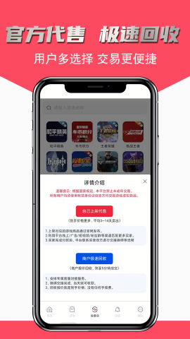 游戏账号交易:平台支持上百款热门游戏账号交易,操作界面简洁明了,一键即可完成上架,让买卖双方都能享受便捷的交易体验。2、游戏账号回收:专业的主播鉴定团队提供快速评估服务,极速完成账号回收、换绑和打款流程,确保卖家资金快速到账。3、终身找回包赔:配备专业的售后团队,为用户提供长期安全保障,一旦出现账号问题立即启动赔付机制,切实保障用户财产安全。