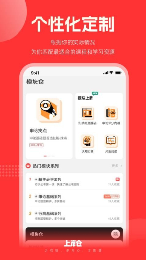 上岸仓是一款专为公职类考试备考设计的优质学习软件,致力于帮助用户高效备考。软件汇集了海量精品课程资源,涵盖公务员、事业单位等各类公职考试内容,用户可根据自身需求自由选择课程进行系统学习。通过智能化的学习路径规划和个性化的课程推荐,用户能够快速掌握核心知识点。同时配套的在线题库和AI批改系统,让用户能够随时检验学习成果,实现学练结合。无论是零基础备考还是冲刺提升,上岸仓都能提供全方位的支持,让备考过程更加科学高效。