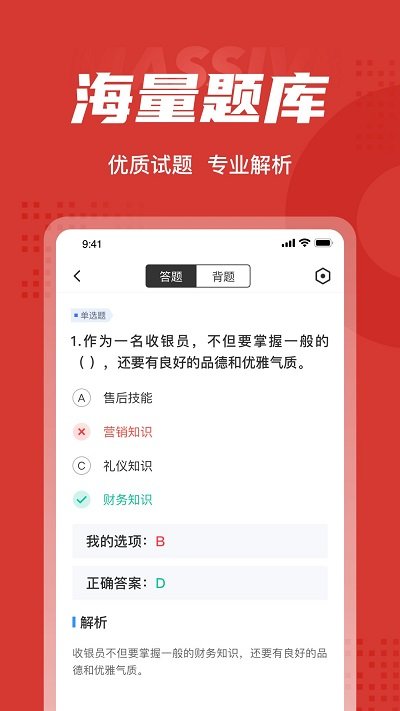 --软件收录了2018-2023年所有省市收银员资格考试的真题,并按照最新考试大纲进行了专业分类。每道题目都配有视频解析和文字详解,帮助用户深入理解考点;