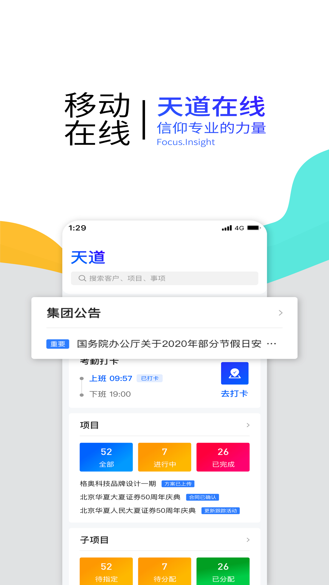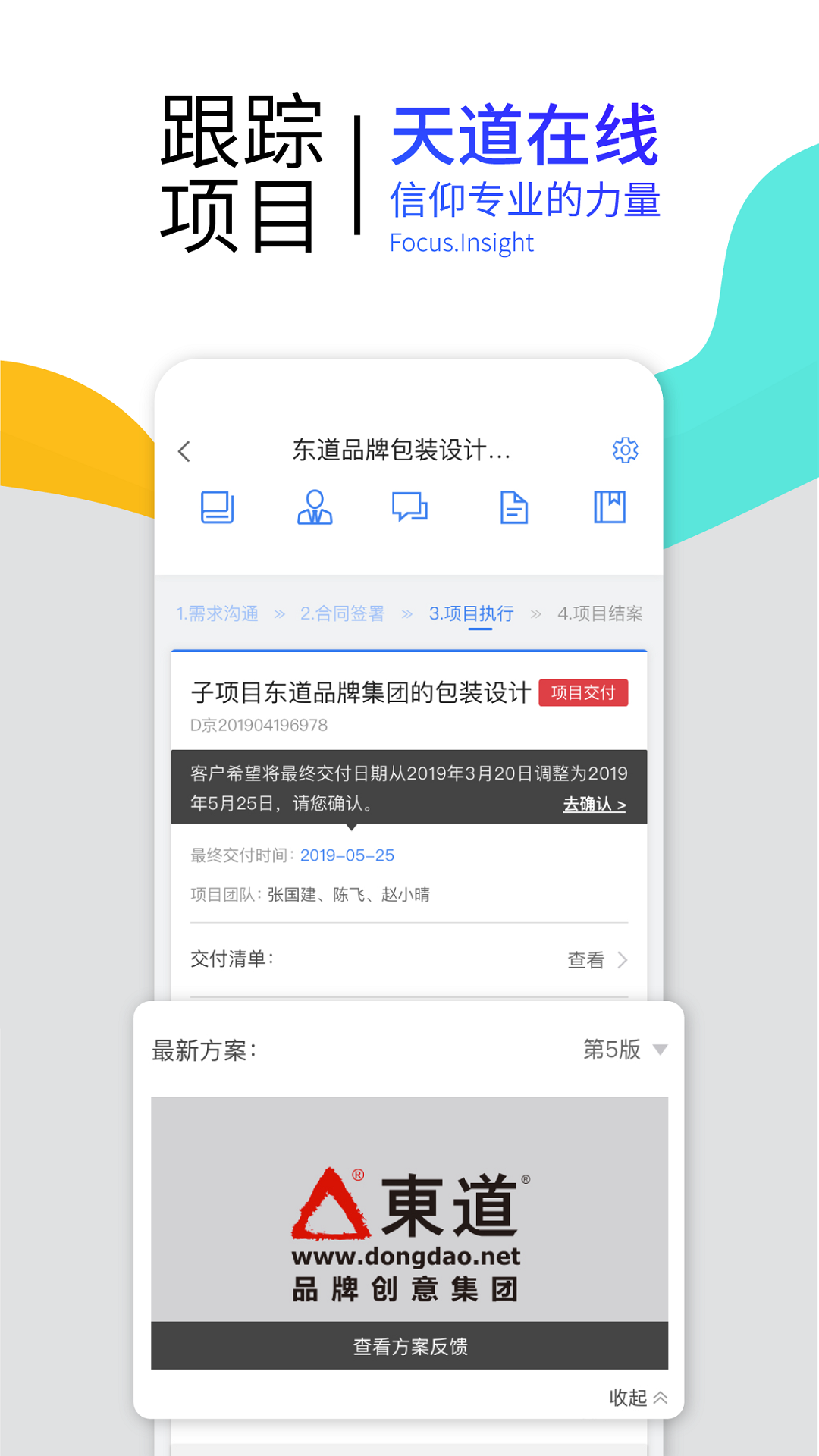 天道APP凝聚了东道品牌创意集团有限公司20年来服务数万家企业和机构的宝贵经验,是专为品牌事业管理打造的移动场景工具。作为行业领先的项目管理解决方案,它集成了东道集团在品牌创意领域的专业智慧,致力于帮助项目管理人员优化工作流程。通过智能化管理工具,天道APP能够显著提升服务品质,让客户和作业人员都能享受到更专业、更高效的服务体验。