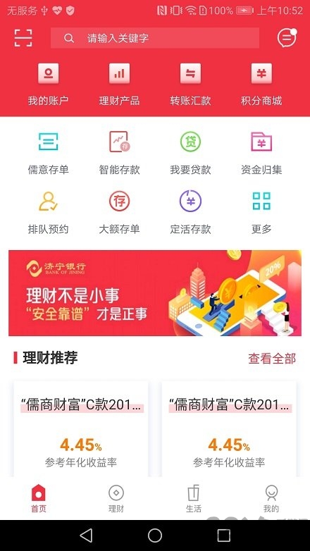 济宁银行手机银行整合了线上线下全渠道金融服务资源,除基础的账户查询、转账汇款功能外,还提供跨行资金归集、大额取现预约、特惠商户查询等特色服务。系统采用智能路由技术,转账交易秒级到账;支持多种认证方式组合,大额交易安全便捷。同时内置智能理财助手,可根据用户风险偏好推荐合适的理财产品,帮助用户实现财富的保值增值。