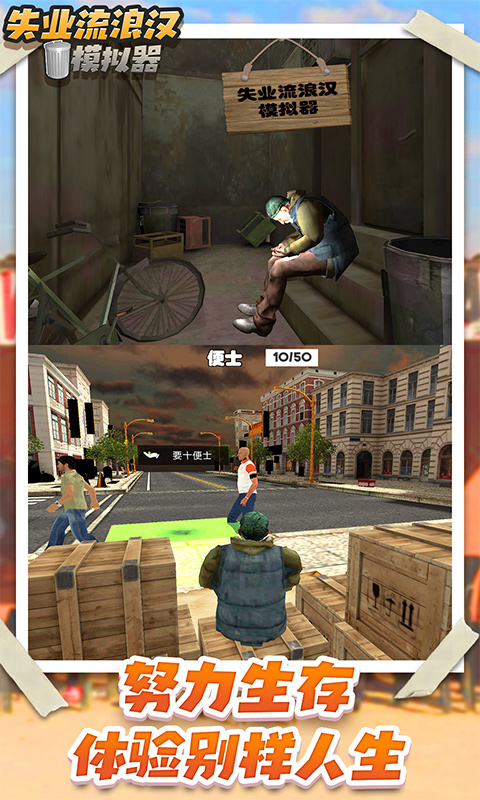 在这个开放世界的城市中,每个角落都可能藏着改变命运的机会。白天你需要穿梭于繁华的商业区和阴暗的小巷,寻找废弃纸箱搭建临时庇护所,用捡来的易拉罐制作简易炊具。夜幕降临时,要提防其他流浪汉的偷袭,同时也要注意躲避城市管理者的驱赶。游戏特别设计了真实的饥饿系统和疾病机制,如果连续三天找不到食物,角色会进入虚弱状态;而长期穿着脏衣服则可能引发皮肤感染。你还可以在游戏中遇到各种随机事件,比如好心人的施舍、地下黑市的交易邀请,甚至是隐藏在废弃地铁站的神秘组织。