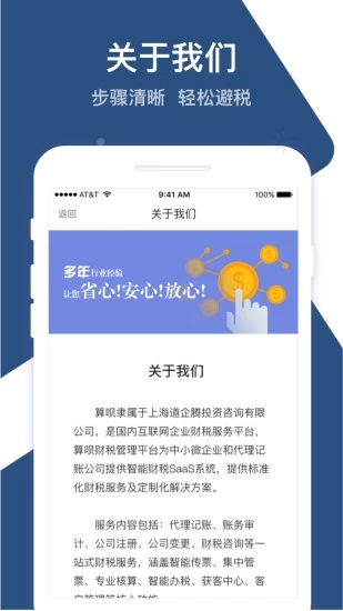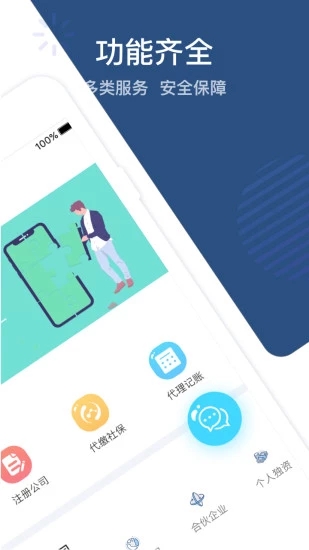 一站式财税办理App是一款专为个人及中小微企业打造的智能化财税服务平台。通过移动互联网技术,平台整合了税务咨询、业务代办、金融对接等全流程服务,让繁琐的税务事务变得简单高效。无论是工商注册、代理记账,还是税务筹划、社保代缴,都能通过手机轻松完成。平台拥有专业的财税顾问团队,提供7×24小时在线服务,确保每项业务都能得到专业指导。采用银行级数据加密技术,保障用户信息安全,让企业主可以放心托付财税事务。现在下载注册,还能享受新用户专属优惠,助力企业轻松应对各类财税挑战。
