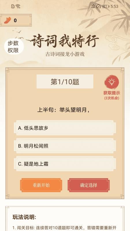 当遇到难题时,用户可以使用提示功能获取解题线索。系统会提供关键词、作者信息等提示内容,既保留了答题乐趣又避免了卡关困扰。提示功能使用次数有限,鼓励用户先独立思考,培养自主学习能力。