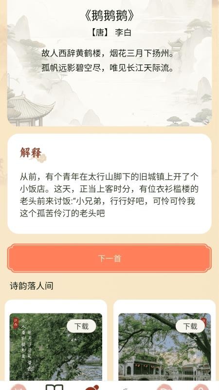 应用特别注重诗词的审美体验,每首作品都配有精美的背景图片和优雅的朗读音频。用户可以在欣赏诗词的同时感受视觉与听觉的双重享受,真正体会"诗中有画,画中有诗"的意境之美。
