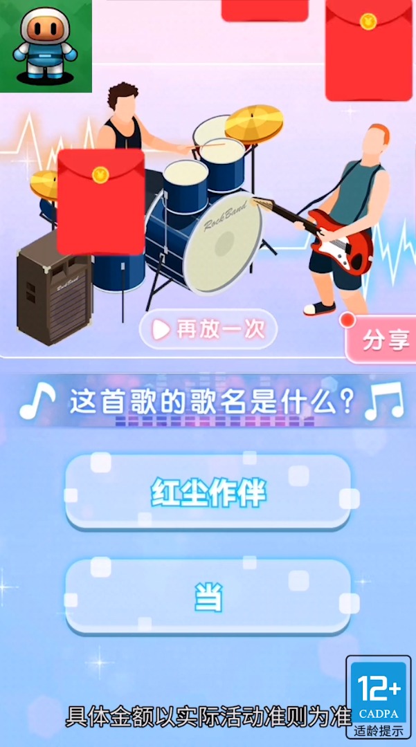 游戏以音乐竞猜为核心玩法,收录了涵盖华语流行、欧美金曲、日韩热歌等上千首经典曲目。玩家需要通过聆听歌曲片段准确猜出歌名,随着关卡提升,题目难度会呈现阶梯式增长。独创的1v1实时对战模式让玩家可以与好友同台竞技,率先猜对五首歌的玩家将获得额外红包奖励。游戏还贴心地设置了自动闯关功能,让玩家在忙碌时也能持续积累收益。