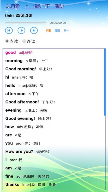5.单词总表功能将教材所有单词按单元和字母顺序分类整理。每个单词都配有标准发音、中文释义和例句,帮助学生系统性地记忆和复习词汇。