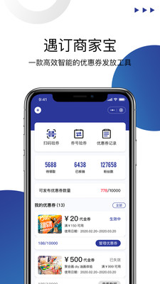 遇订商家宝APP是一款专为商家打造的智能优惠券发放工具,旨在帮助商家高效管理营销活动并提升顾客到店转化率。该应用支持多种优惠券类型创建,如立减券、满减券等,满足不同营销需求。商家可通过扫码验券功能快速核销优惠,同时利用抽奖裂变活动吸引新顾客。此外,无需开发即可生成商家小程序主页,轻松实现线上获客。无论是单店还是连锁门店,都能通过手机便捷管理运营数据,降低运营成本,让营销更简单高效。