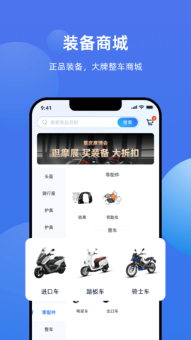 装备商城:提供正品摩托车装备、配件和周边产品的购买渠道。