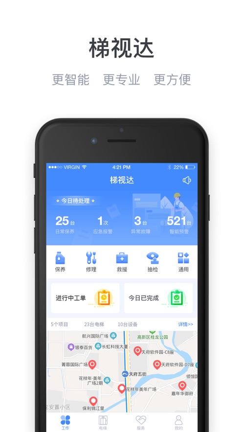 梯视达APP是一款专为电梯维保行业打造的智能移动服务平台,致力于通过数字化手段提升电梯安全管理效率。平台整合了维保监管、智慧救援、电梯管理等核心功能模块,采用先进的技术架构实现全流程电子化作业。无论是电梯维保公司管理人员还是现场维修技工,都能通过该平台高效完成日常工作。系统支持多终端协同操作,数据实时同步至云端,确保信息传递的及时性和准确性。通过智能化预警机制和电子化工单系统,大幅降低人为操作失误风险,为电梯安全运行提供全方位保障。