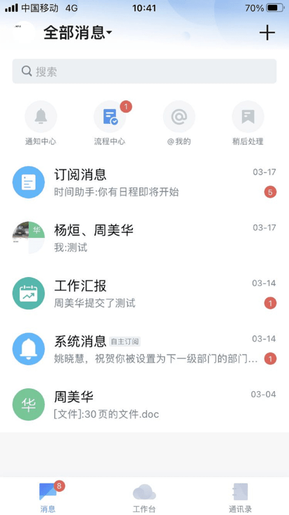 IM通讯功能通过企业通讯录实现跨部门即时沟通,支持消息状态显示和智能提醒。时间管理功能结合个人日程与团队共享,实现工作安排的透明化和协同化。智能工作台根据用户角色定制专属界面,突出显示优先级任务和应用入口。应用中心整合了企业ERP轻量应用和第三方系统,构建统一业务操作平台,大幅提升工作效率。
