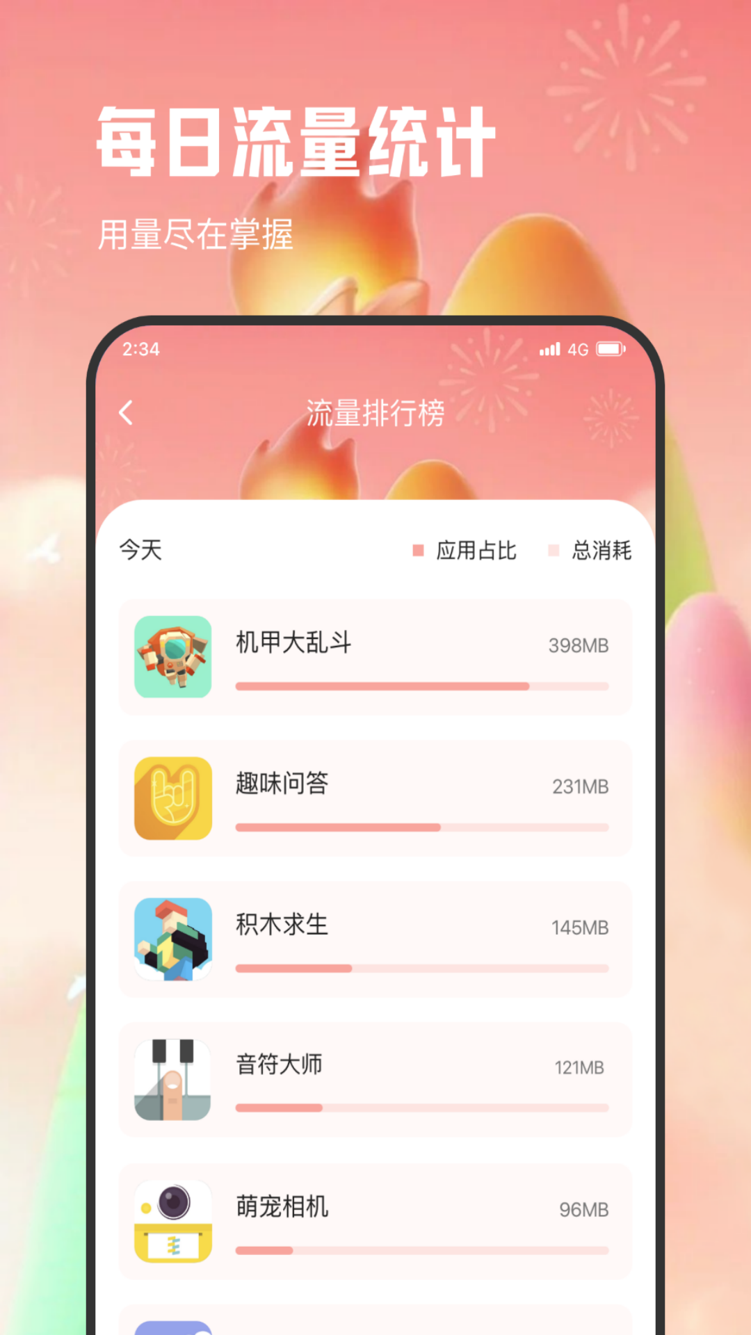 明辉流量专家的最大亮点在于让用户随时掌握流量使用情况,通过实时数据更新,用户可以清晰了解每个应用的流量消耗情况。应用支持设置每日流量上限,有效避免因流量超额使用而产生额外费用。同时,用户可以通过详细的历史记录查询功能,了解每天、每周甚至每月的流量使用情况,真正做到心中有数。