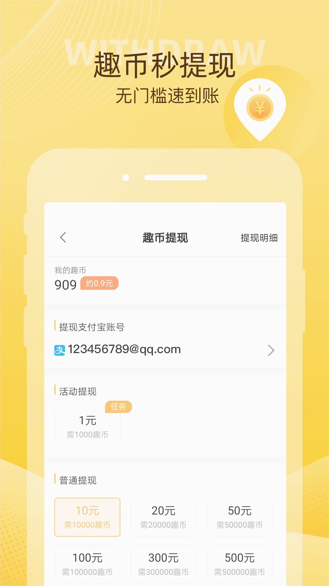 无门槛快速提现,操作轻松,提现申请即时处理,最快5分钟到账,让收益真正掌握在自己手中。
