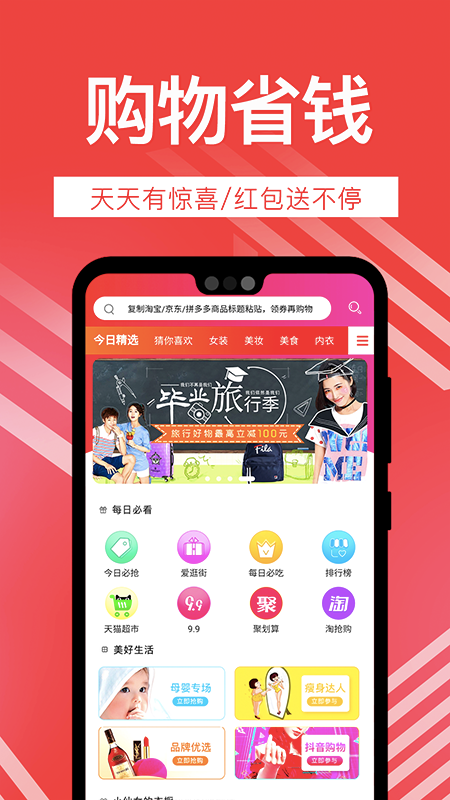 手机淘券猫app是一款专为网购达人打造的优惠购物平台,让您享受前所未有的省钱体验。在这里,您可以轻松领取各大电商平台的优惠券,包括拼多多、京东等,享受超低折扣。每天都有海量新品上架,涵盖女装男装、护肤美妆、数码家电等全品类商品,满足您的多样化需求。更有疯抢排行榜和天天特价专区,帮您快速找到超高性价比好物。无论是日常购物还是节日大促,手机淘券猫都能让您省心又省钱,轻松享受网购乐趣。