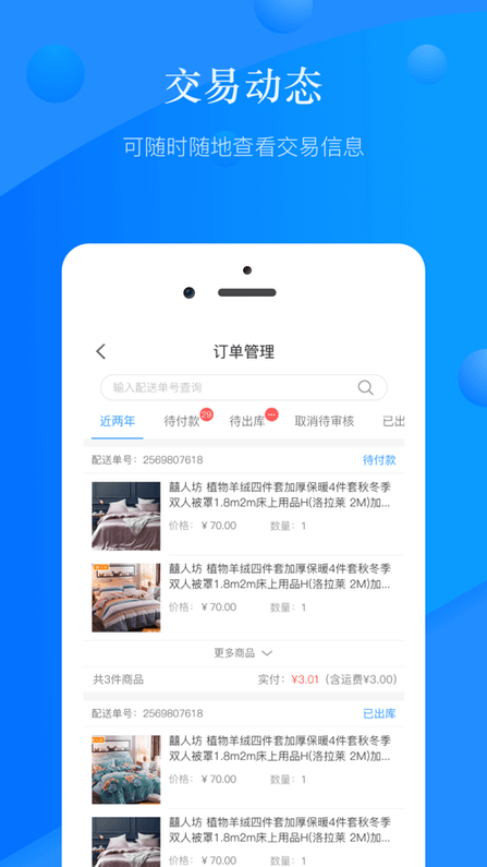 支持查询近两年的历史订单,快速查看待付款、待出库等不同状态的订单详情。完善的订单处理流程帮助商家高效完成交易管理。