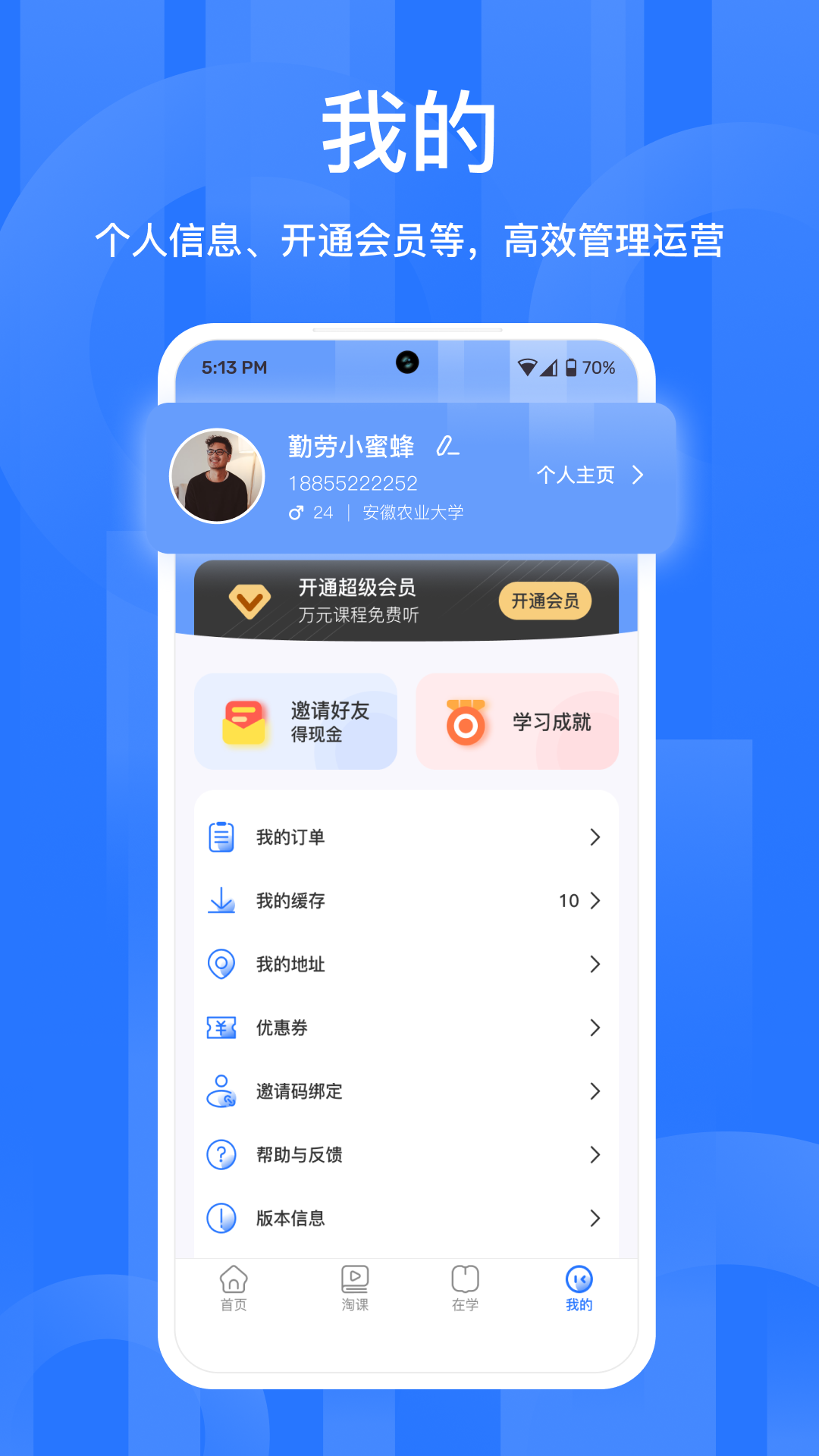 首页:智能推荐优质课程,精选上千门精品课程供用户选择,根据学习偏好个性化推送;淘课:涵盖职场技能、语言学习、IT技术等数十种课程品类,全方位满足不同用户的学习需求;在学:实时追踪学习进度,清晰展示已完成和待学习内容,帮助用户合理安排学习计划;我的:集中管理个人信息、会员服务、学习记录等,提供一站式的账户管理功能,让学习更高效便捷。