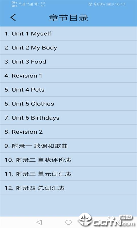 Unit1 Myself:学习自我介绍相关表达,掌握基础交际用语。Unit2 MyBody:认识身体部位名称,学习描述外貌特征。Unit3 MyFood:了解常见食物词汇,掌握饮食相关句型。Unit4 Revision:综合复习前三个单元内容,巩固学习成果。Unit5 MyPet:学习宠物相关词汇,培养爱护动物的意识。Unit6 MyClothes:掌握服装类单词,学习穿着打扮的表达。Unit7 MyBirthday:了解生日相关用语,学习日期表达方式。Unit8 Revision:全面复习整册内容,为期末考试做准备。附录部分提供活动手册录音材料及练习答案,方便课后练习和自测。